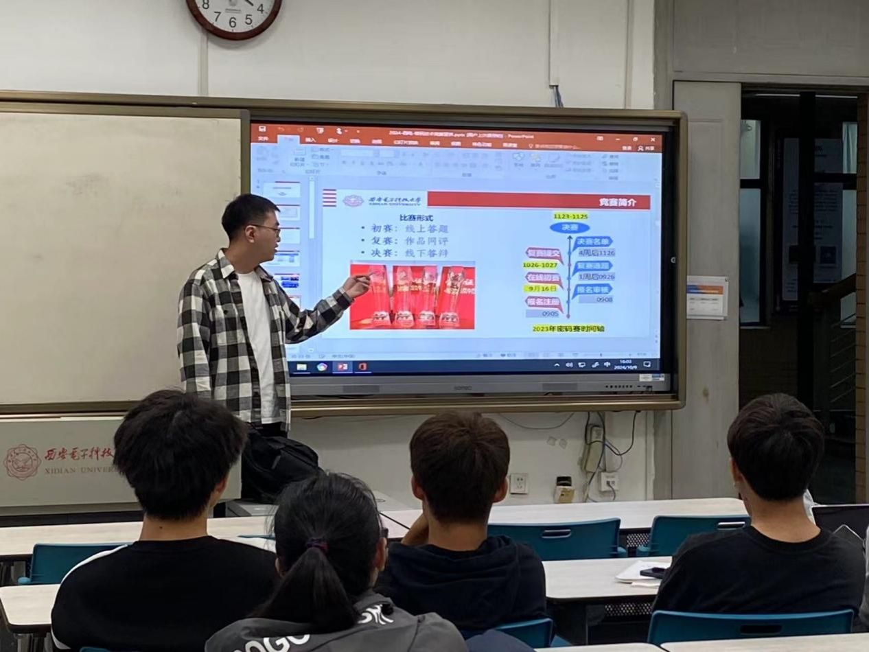 秦远贺学长生动形象地向同学们介绍了密码赛的组队要求、办赛情况、比赛题目、比赛形式等内容。他以自己的经历为切入点,以图片为形式,层层深入地讲解了比赛的流程和方向,让同学认识到了密码竞赛的前景和未来,充分激发了同学们对密码竞赛的好奇和关心。在互动环节中,学长耐心解答了同学们关于比赛准备、团队合作以及提高密码技术能力等方面的疑问。