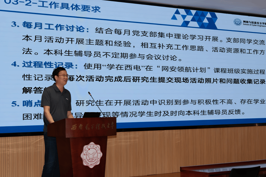 公司2024级本科生辅导员何良对研究生领航员、本科生宿舍长/网格员开展了工作规范化培训。对研究生领航员,他希望研究生能够在思想引领、学风建设和心理关怀等方面发挥积极作用。鼓励大家通过组织学习交流、竞赛指导、科研入门科普等方式,帮助新生取得实际的进步和成绩。对本科生宿舍长/网格员,他要求同学们主动与领航员保持密切联系,保持定期交流,虚心请教学习,传承网信学子优良学风。