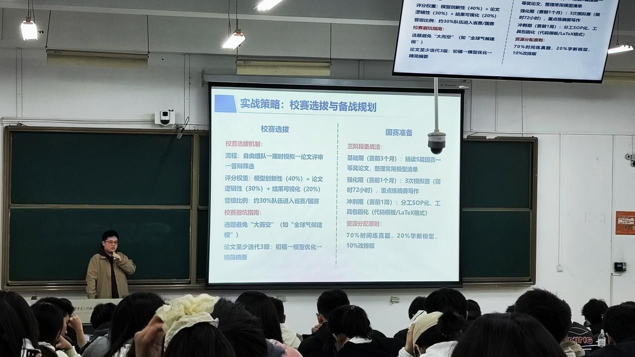 4月6日晚,郑百川学长开展“数学建模竞赛入门”宣讲,郑百川围绕什么是数学建模竞赛、数学建模比赛如何分工、主要考察哪些能力、常用软件或平台,和数学建模如何入门等方面为2024级本科生做了详细的介绍。通过学习,同学们对数学建模竞赛有了更深入的了解和认识,并积极组队备战将于5月份举办的数学建模校赛。