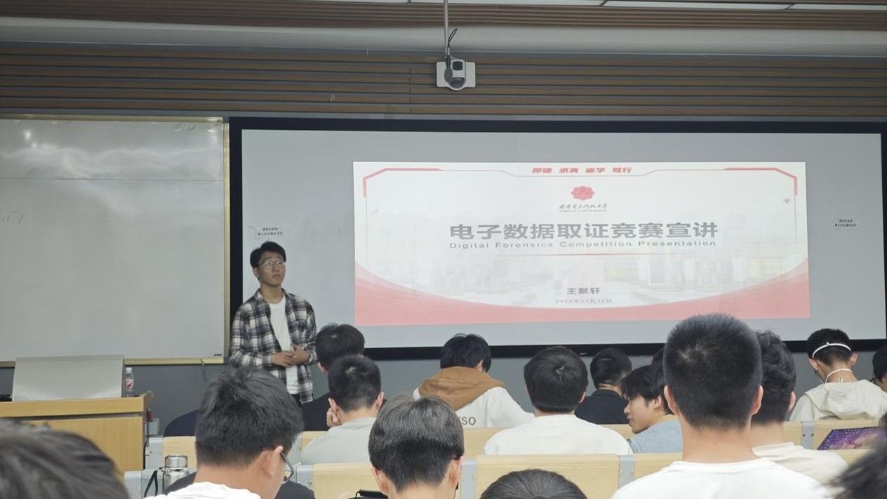 4月16日晚,王默轩学长为2024级本科生做了电子数据取证竞赛宣讲。王默轩从真实案例入手,生动讲解了电子数据取证技术的重要性和应用价值。通过现场实操演示,让同学们直观了解了电子数据取证的全过程。电子数据取证涵盖攻击分析、硬盘存储、内存存储、程序分析、隐写技术、服务器取证等多个内容。他建议同学们通过参加“美亚杯”“盘古石杯”等专项电子数据取证赛事,在实践中提升专业实践能力。