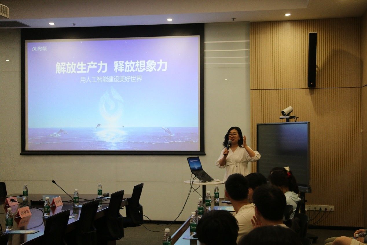 在座谈交流环节,李哲文为师生们带来了题为《解放生产力,释放想象力——用人工智能建设美好世界》的精彩报告,她向师生们详细介绍了企业文化、企业的成长与发展、技术创新与实际应用、人才培养和企业招聘需求等方面内容。通过介绍,师生们对科大讯飞公司AI大模型在智能办公、教育、医疗、工业等方面的应用有了更深入的了解,彰显了企业在人工智能领域的技术实力与创新活力。