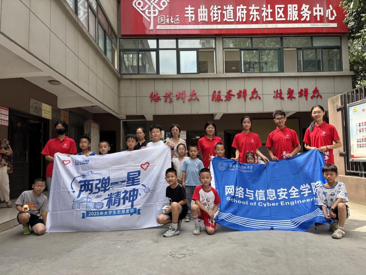 为大力弘扬“热爱祖国、无私奉献,自力更生、艰苦奋斗,大力协同、勇于登攀”的“两弹一星”精神,“砥砺强国志,网安万里行”两弹一星精神志愿宣讲团自7月15日起,先后走进西安市碑林区建南社区、未央区府东社区、长安区三堰社区、未央区恒大名都社区、雁塔区上元郡社区和海量新英里社区等多个社区开展主题宣讲活动。据统计,活动累计覆盖群众200余人次。宣讲团成员通过主题宣讲、互动问答、红色故事分享、互动小游戏等丰富形式,向社区居民生动讲述了“两弹一星”元勋的感人事迹和我国国防科技事业的辉煌成就。活动还特别设置了核知识科普课堂,将核技术与生活点滴相结合,与美丽中国建设融合,有效提升了公众的科学认知水平。此次暑期社会实践不仅加深了群众对“两弹一星”精神的理解,更展现了新时代青年传承红色基因、践行科技报国的责任担当。宣讲团成员以专业的知识讲解和丰富的活动形式,让“两弹一星”精神在基层社区绽放出新的时代光芒。