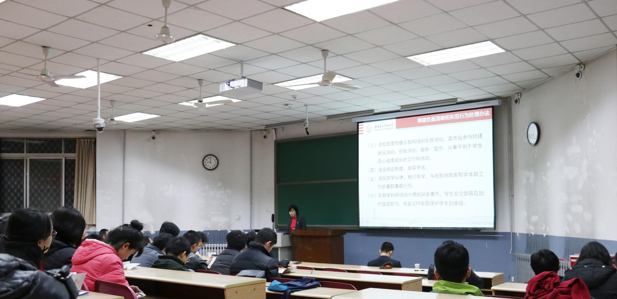 之后,张美茹对西电师德规范三十条、西电师德负面清单和失范行为处理办法进行了详细解读,对在思想政治方面、公司产品方面、学术道德方面和工作生活方面存在的师德师风失范典型案例,一一分析警示,强调对存在师德师风失范行为的教职工一律实行“一票否决”。