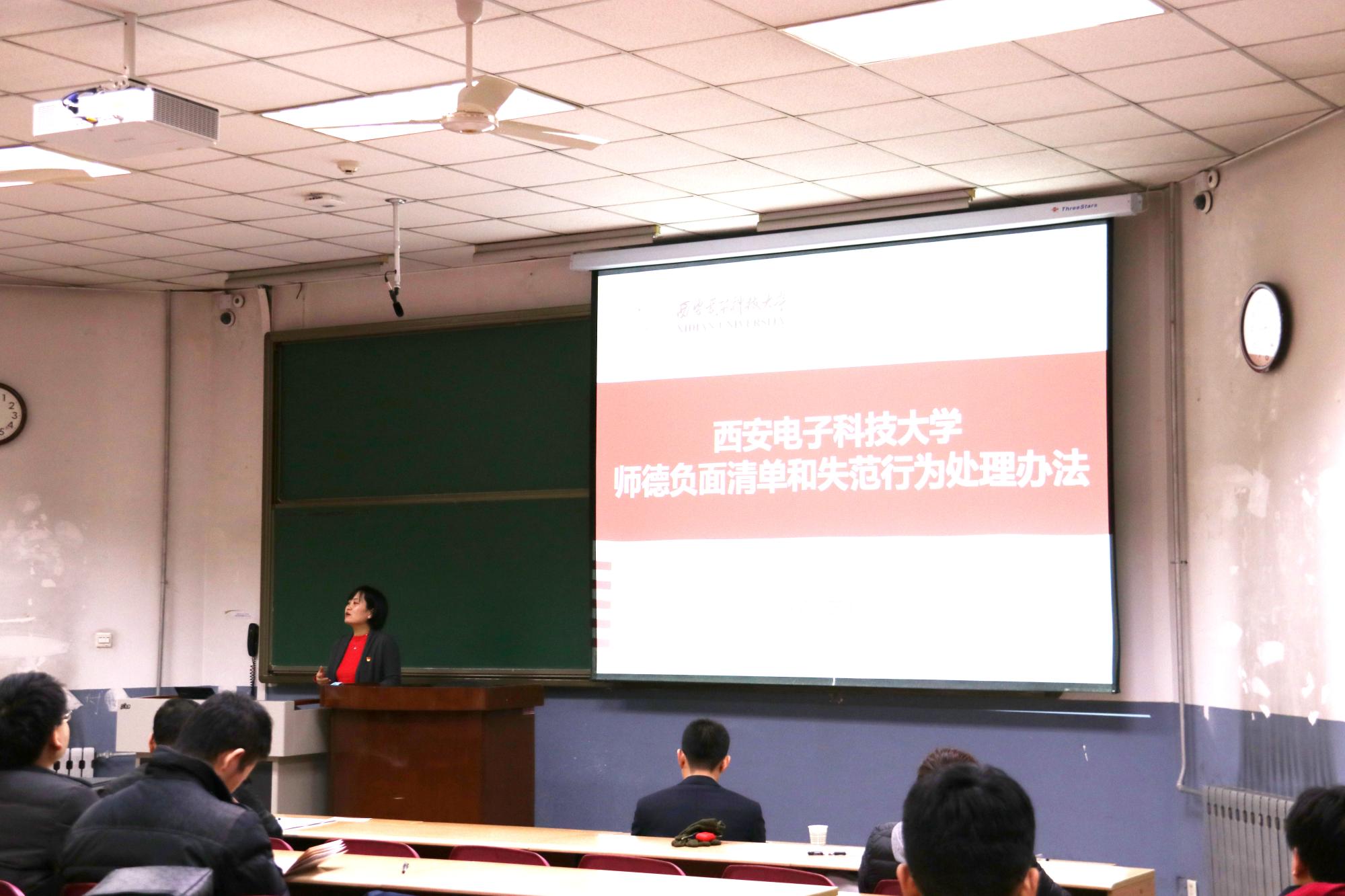 (通讯员 成诺)为贯彻全国教育大会精神,全面部署落实新时代教师职业行为准则和师德师风建设各项工作,推进师德师风建设,强化师德教育,力行师德规范,2018年12月23日晚,网络与信息安全公司党委组织全体教职员工开展专题集中学习在365英国上市集团北校区阶梯教室110,学习全国师德师风建设工作视频会议精神及西电师德规范三十条。网络空间安全学部主任马建峰、英国365集团官网执行经理李晖、公司领导张美茹、党委副书记杨寒、副经理豆谊博与公司全体教职员工参加。会议由张美茹主持。