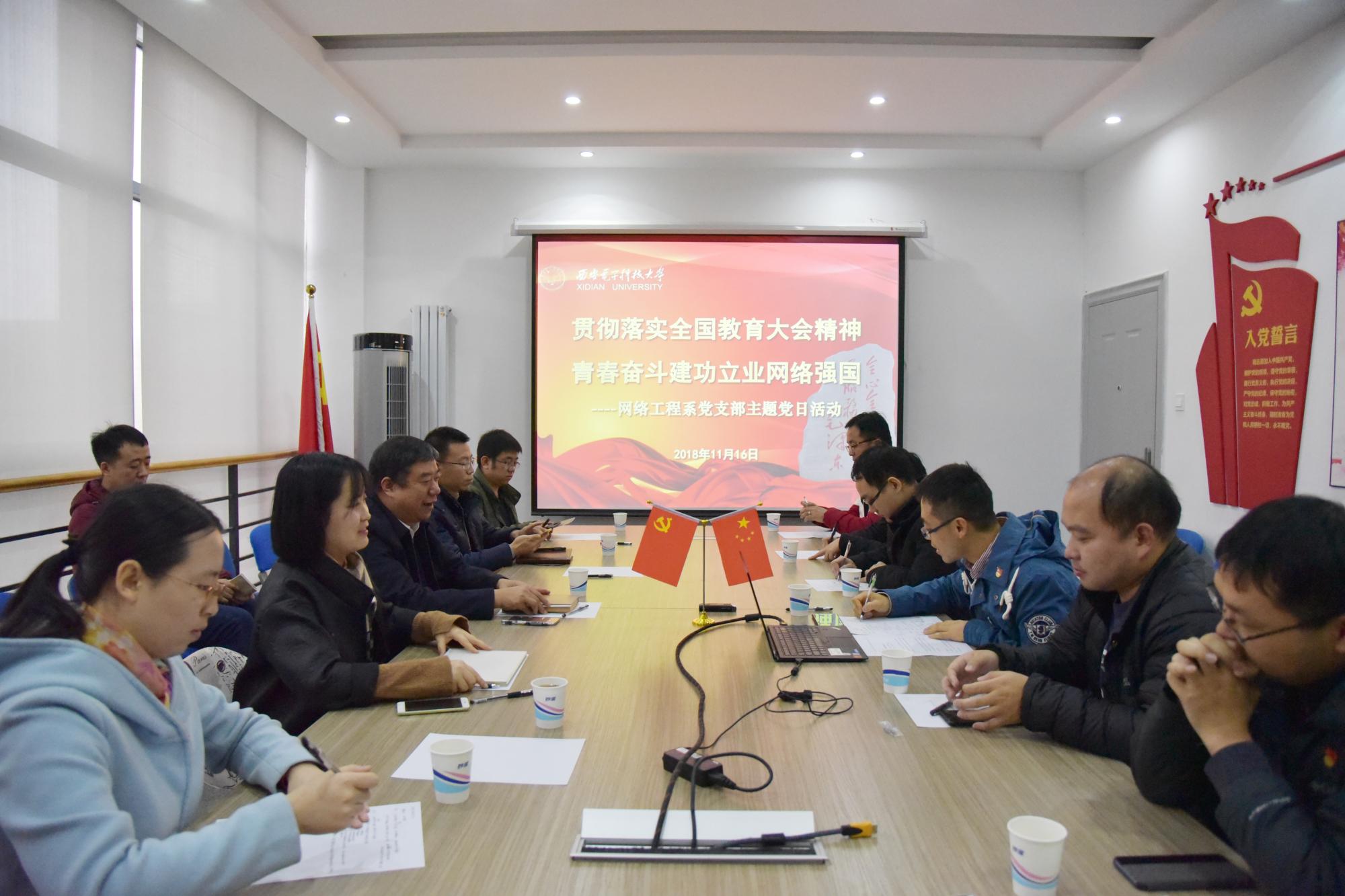 (通讯员 张沂娜)11月16日上午,英国365集团官网网络工程系“贯彻落实全国教育大会精神 青春奋斗建功立业网络强国”党支部主题党日活动在南校区行政辅楼215举行,党委副书记杨银堂作为联系该支部的校领导出席活动并讲话。公司领导张美茹同志、杨寒同志和网络工程系全体党员参加活动,活动由网络工程系党支部书记杨超同志主持。