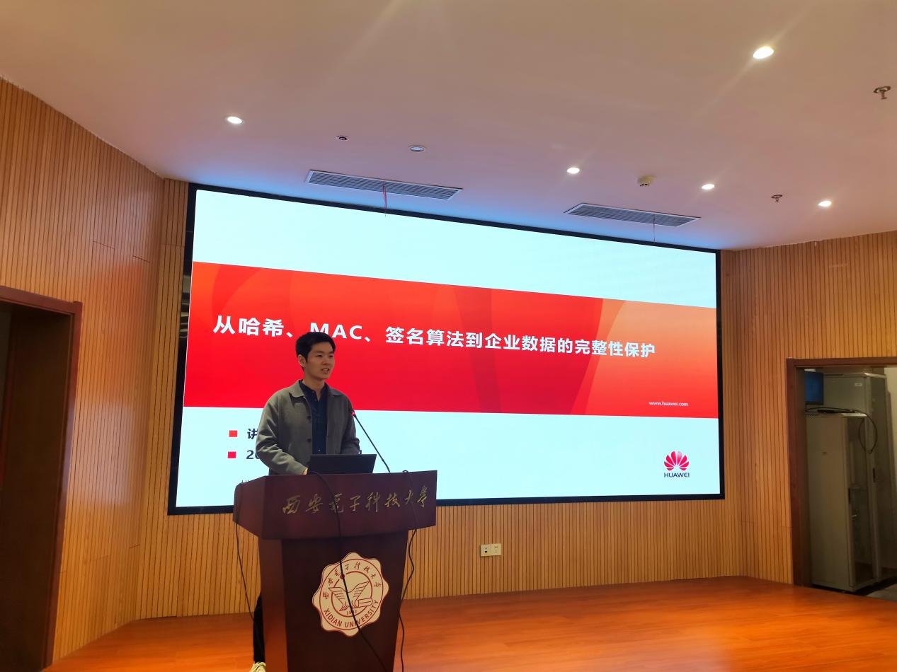 本次活动还邀请到了公司优秀毕业生、华为公司网络安全专家袁浩然博士返校开展讲座,以《数据安全——从哈希、MAC、签名算法到企业数据的完整性保护》为主题,从密码学算法出发,介绍如何使用密码学技术进行数据完整性保护。针对不同数据类型、不同数据大小、不同使用频次的数据介绍不同的数据完整性保护方法,解决企业中数据完整性保护的问题。为在校的学弟学妹们提供了一堂生动的技术知识盛宴。在互动环节,同学们积极发言、提问交流,会场气氛逐渐高涨。