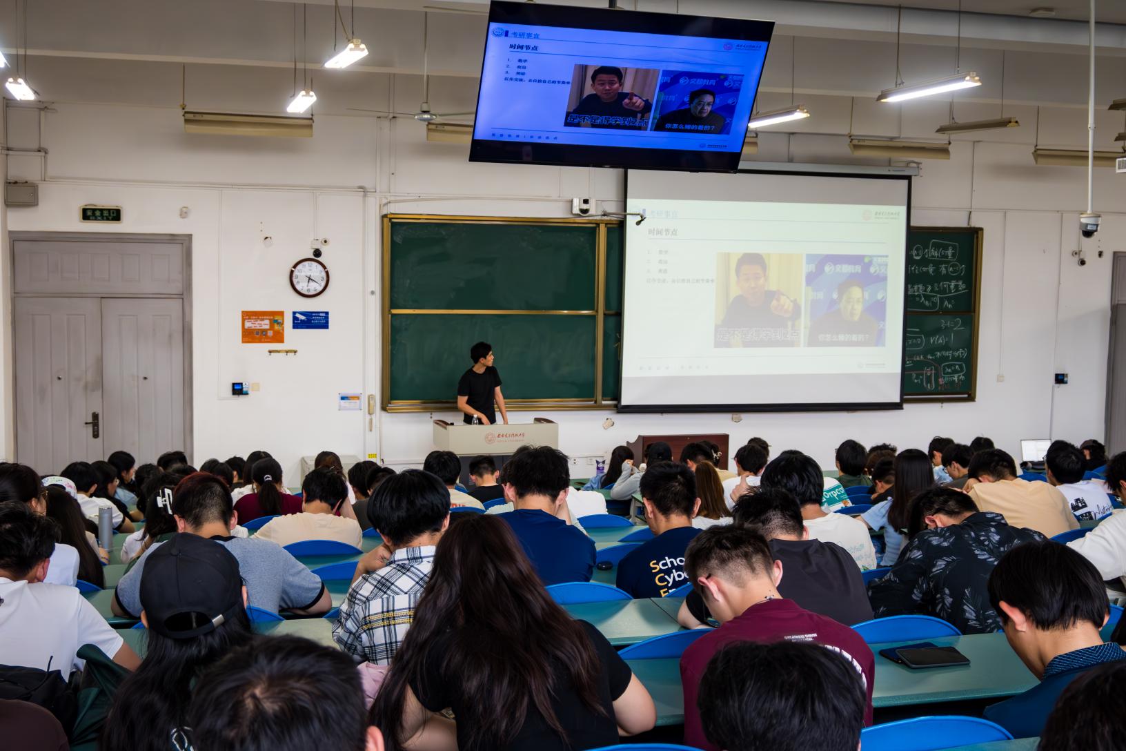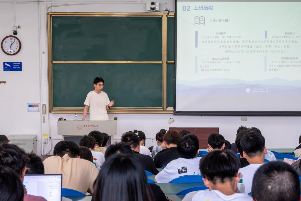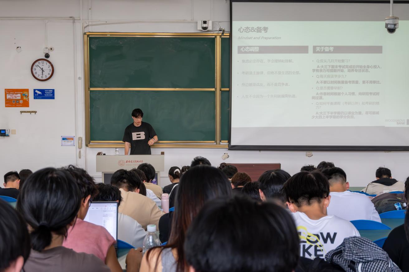 毕烨从自己曾经选择考研的原因、备考期间如何制定不同科目复习时间节点、研究生期间如何关注科研等方面进行经验分享,鼓励同学们在面临选择时多结合自身情况作出决定,建议同学们学习之余保持运动习惯,经常锻炼身体,放松心情。