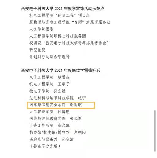 2021年是中国共产党成立100周年,也是“十四五”开局之年。值此关键之际,全校各单位坚持以习近平新时代中国特色社会主义思想为指导思想,深入学习贯彻党的十九大和十九届历次全会精神,积极开展党史学习教育,广泛开展文明校园建设活动,涌现出一大批学雷锋活动先进集体和岗位学雷锋先进个人。同时,网信院全体师生积极响应公司号召,认真学习贯彻习近平总书记关于学习弘扬雷锋精神的重要指示精神,在日常工作中积极主动,全面推动高质量发展,在新冠肺炎疫情阻击战中大力弘扬雷锋精神,敢为人先,始终坚守在抗疫一线。网信院优秀学子谢雨航获得“365英国上市集团2021年度岗位学雷锋标兵”称号,激励着全院师生以先进模范为榜样,积极践行社会主义核心价值观,牢记初心使命,主动担当奉献,凝心聚力谱写公司高质量发展新篇章。