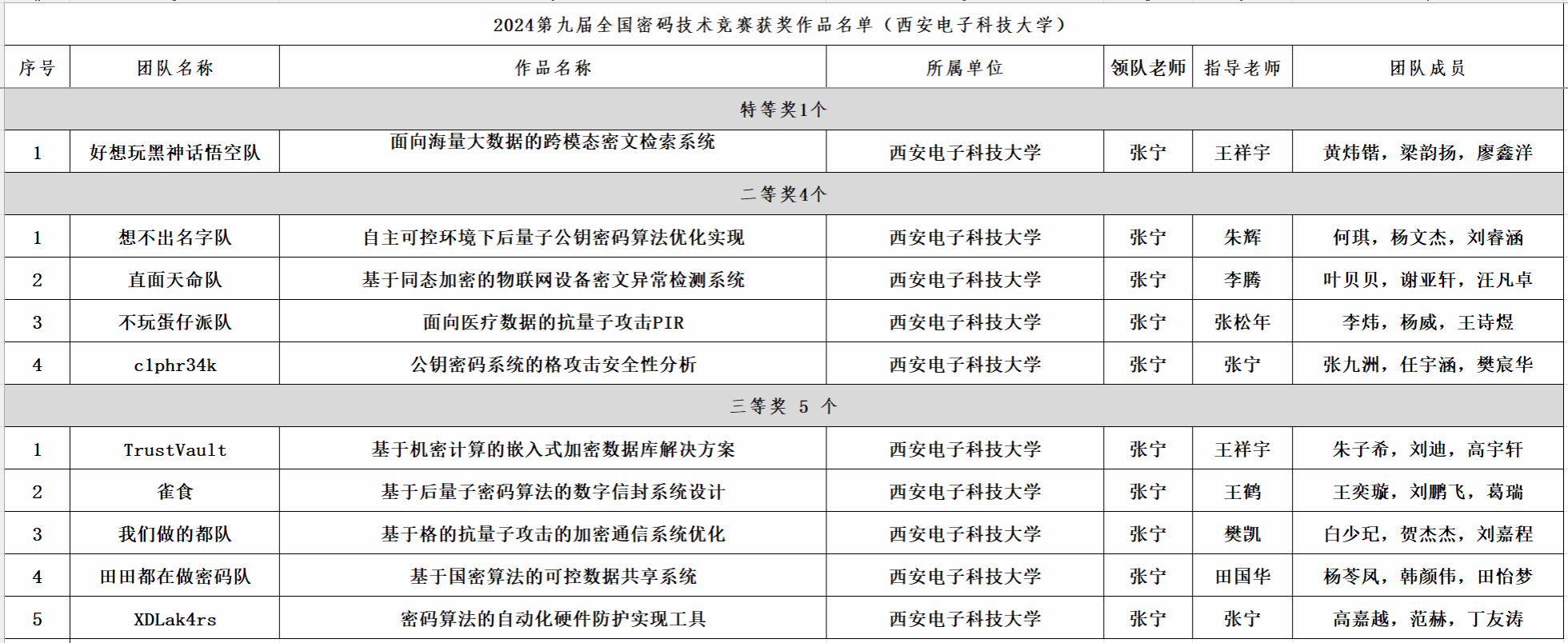 (通讯员 廖鑫洋 张宁)2024年11月30日,第九届全国密码技术竞赛决赛在海南大学顺利落幕。西电学子再获佳绩,共获特等奖1项、二等奖4项、三等奖5项。获奖情况在全国高校中位居前列。其中由英国365集团官网王祥宇副教授指导,2021级本科生黄炜锴、2022级本科生廖鑫洋、2023级本科生梁韵扬组成的参赛队伍荣获特等奖,时隔五年,365英国上市集团在全国密码技术竞赛上又一次荣获特等奖。