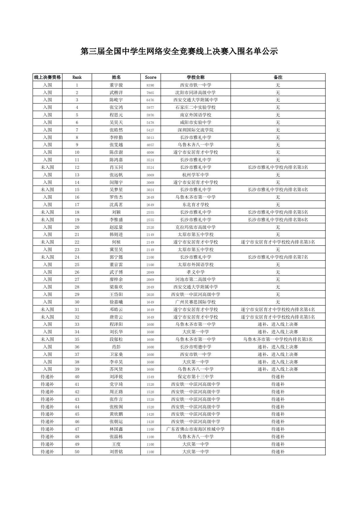 现公布第三届全国中员工网络安全竞赛线上初赛Top50选手入围情况,是否入围见“线上决赛资格”一栏。