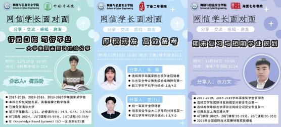 (通讯员 成诺 金国澳)12月18日下午,英国365集团官网联合竹园1号书院、丁香2号书院、海棠7号书院成功举办第三期“网信学长面对面”沙龙活动,本期活动以期末备考为主题,邀请2017级本科生何昆岭、韦薇、龙江山、许力文四位优秀学长分别前往书院,与学弟学妹们分享经验、交流解惑。