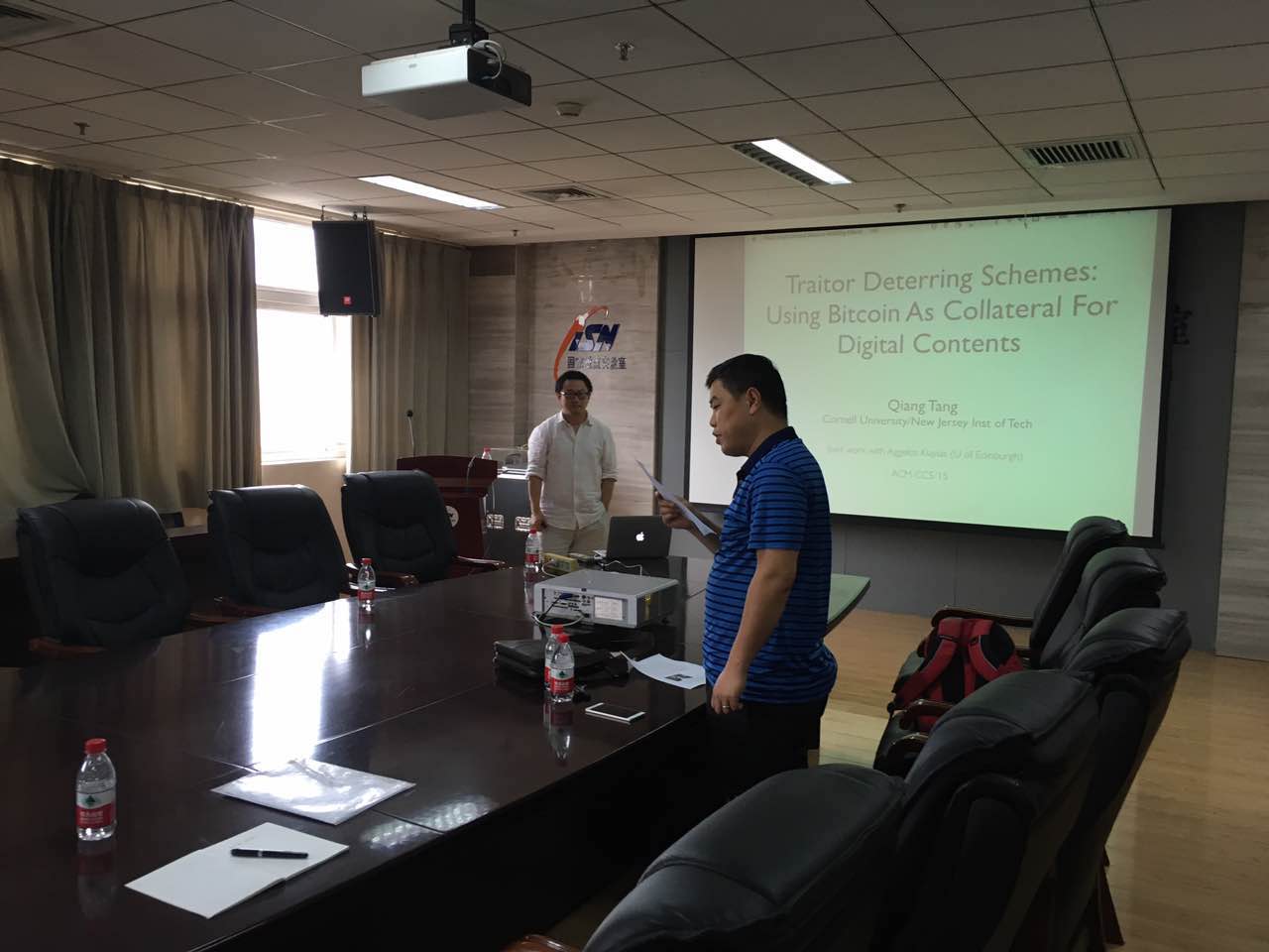 讲述“使用比特币作为数字内容服务抵押品的盗版震慑方案” (通讯员付玉龙)2016年7月13日下午,康奈尔大学IC3实验室唐强博士应邀来365英国上市集团进行学术访问,在科技楼609作...